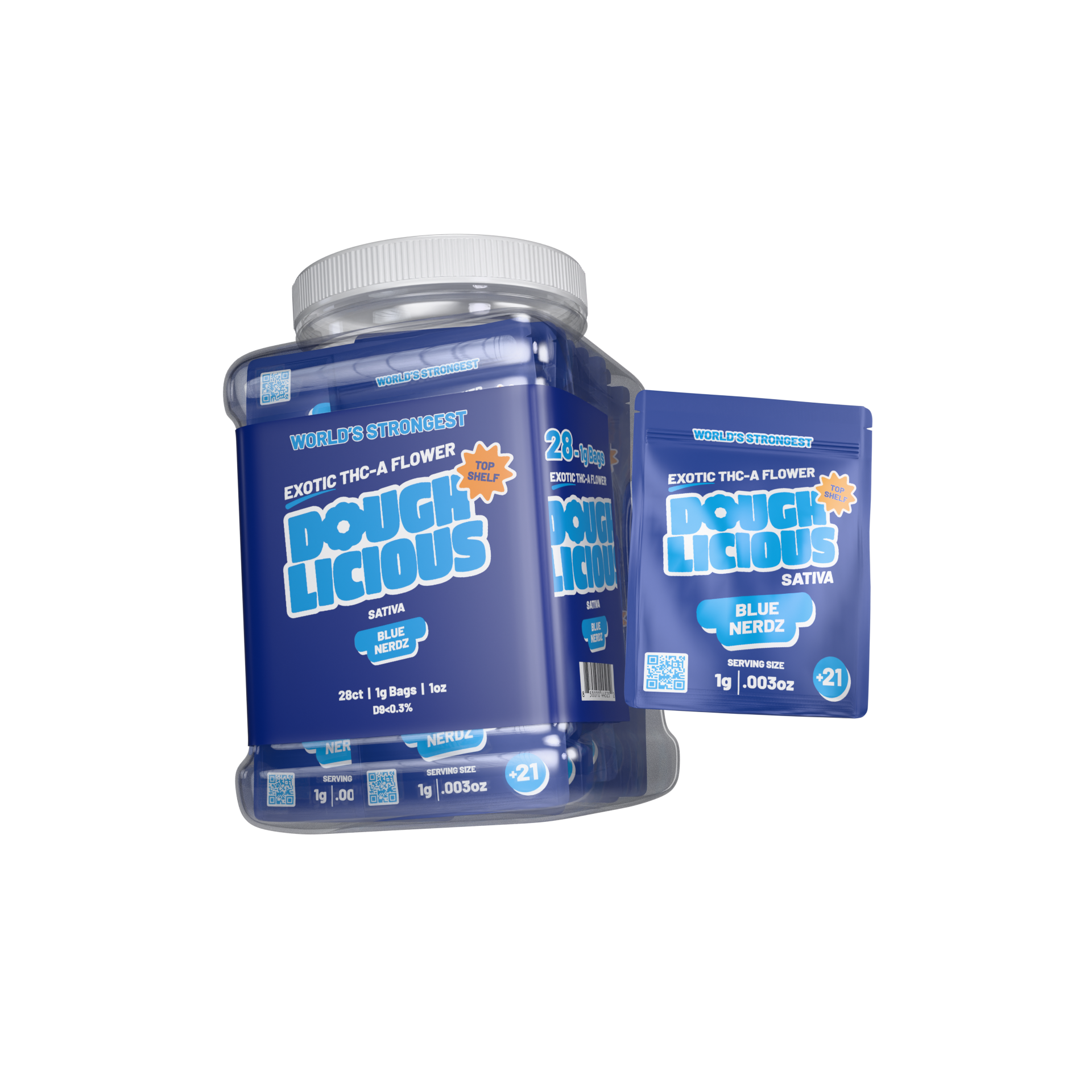 Doughlicious is known for its exotic, hand-trimmed THCA flower with rich terpene profiles. Each jar is slow-cured to ensure maximum flavor and potency. Blue Nerdz (Sativa) has a sweet, berry-forward flavor with an energetic, euphoric high.