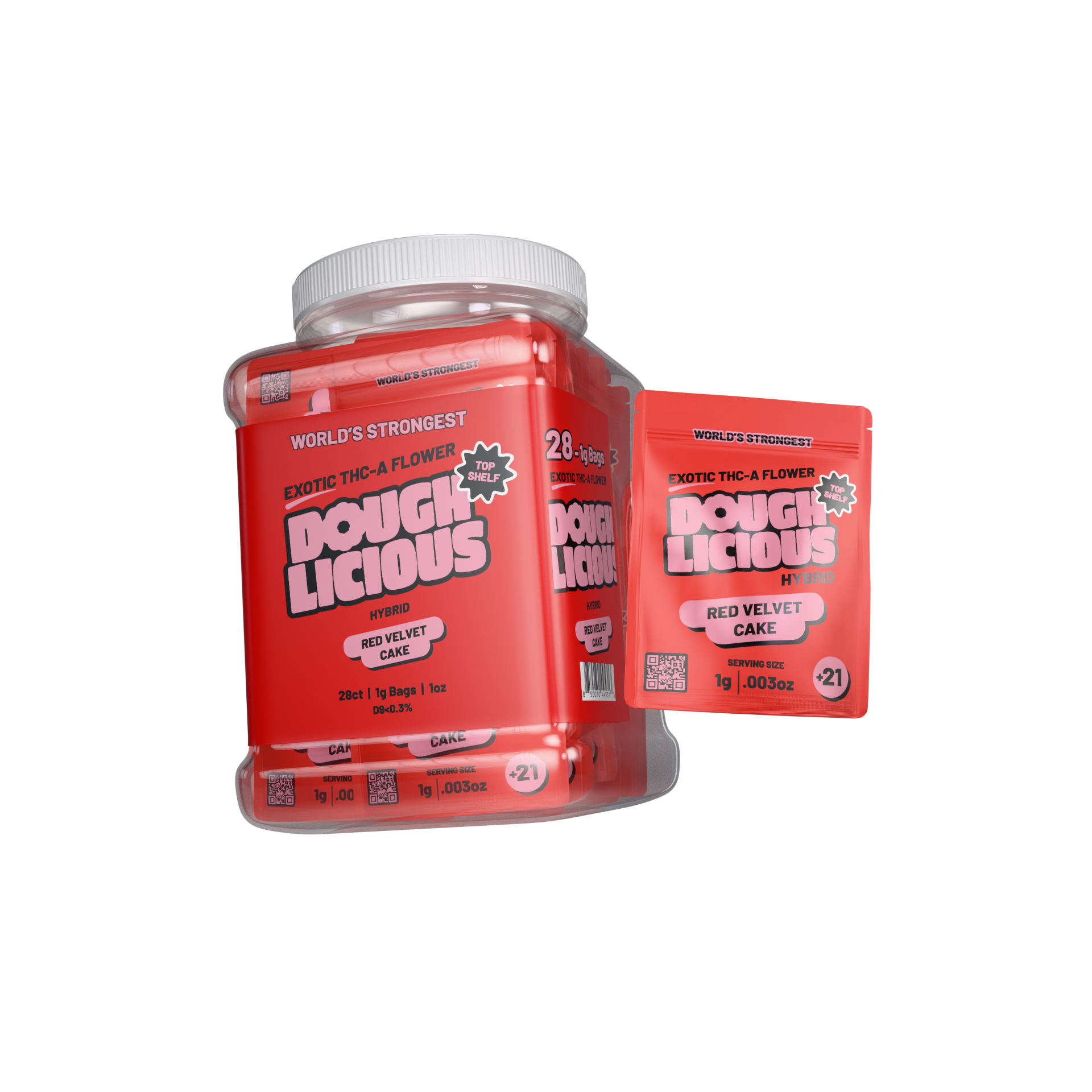 Doughlicious is known for its exotic, hand-trimmed THCA flower with rich terpene profiles. Each jar is slow-cured to ensure maximum flavor and potency. Red Velvet Cake (Hybrid) has a sweet, creamy experience with a balanced high.
