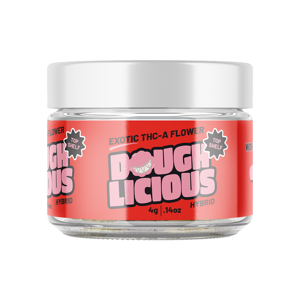 Doughlicious is known for its exotic, hand-trimmed THCA flower with rich terpene profiles. Each 4g jar is slow-cured to ensure maximum flavor and potency. Red Velvet Cake (Hybrid) has a sweet, creamy experience with a balanced high.