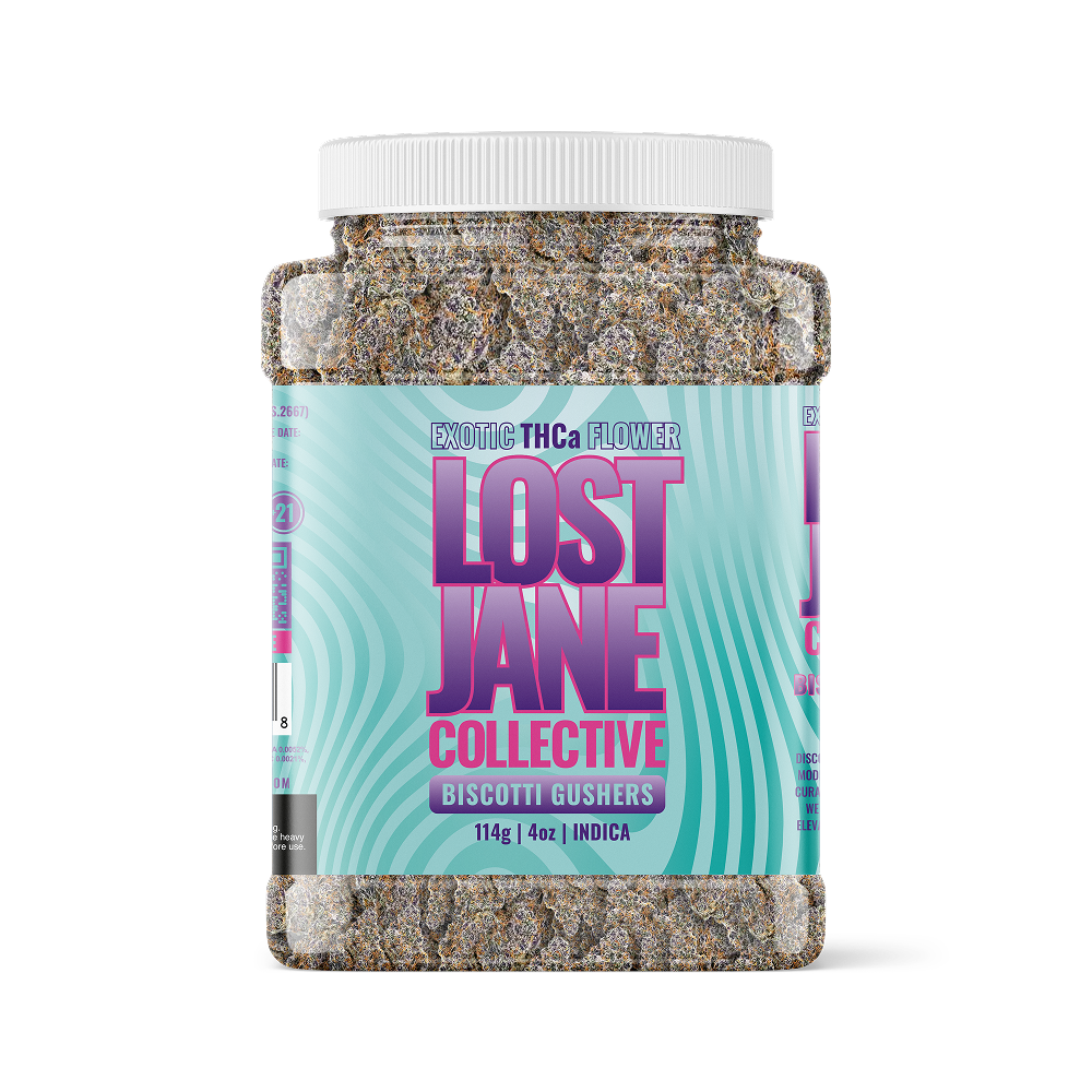 Lost Jane offers a selection of premium QP jars, each filled with top-tier THCA flower known for its potency and flavor—featuring strains like Biscotti Gushers (Indica), a relaxing cultivar with sweet and nutty undertones.