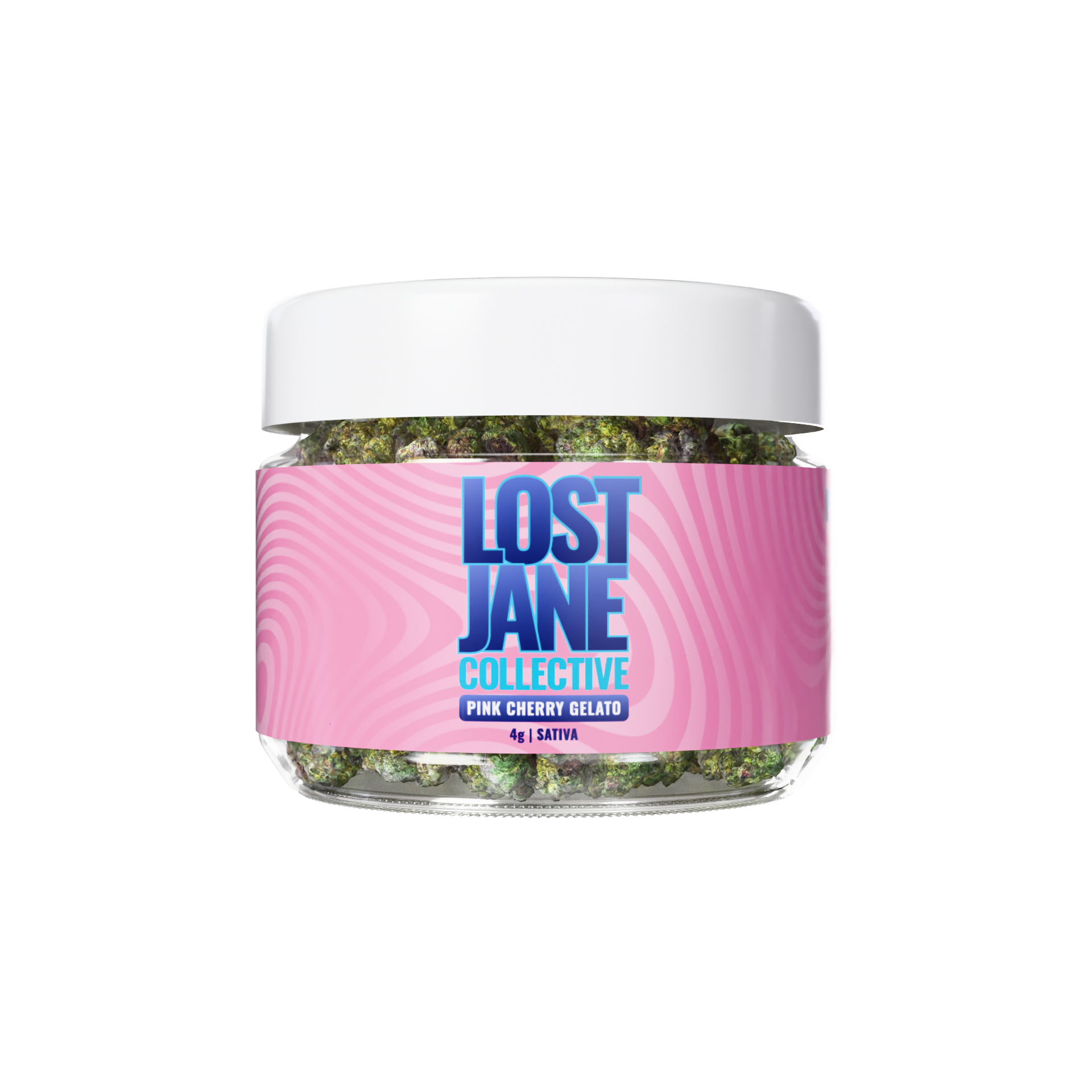 Lost Jane offers a selection of premium 4G jars, each filled with top-tier THCA flower known for its potency and flavor—featuring strains like Pink Cherry Gelato (Sativa), a cherry and creamy gelato blend offering focus and energy.