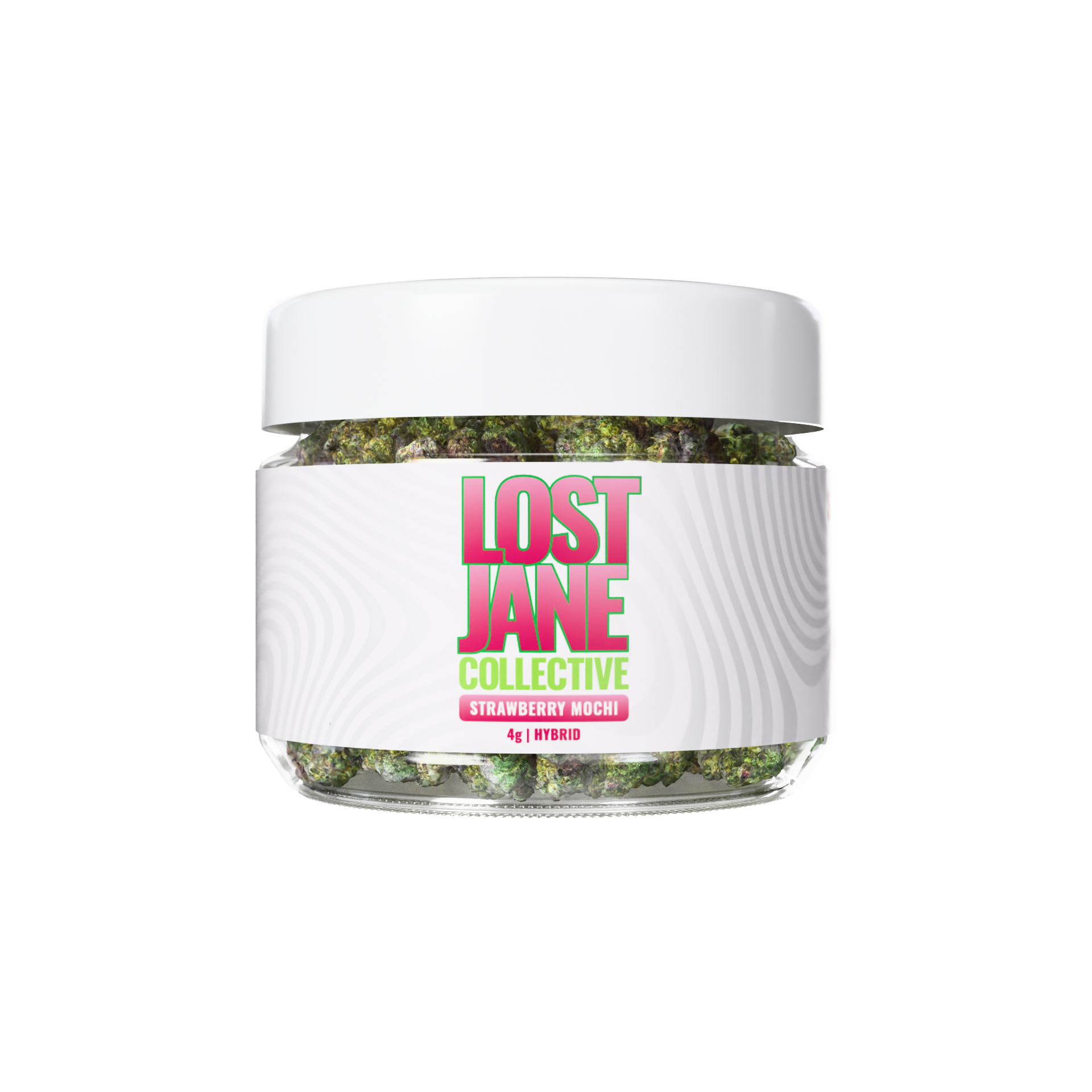 Lost Jane offers a selection of premium 4G jars, each filled with top-tier THCA flower known for its potency and flavor—featuring strains like Strawberry Mochi (Hybrid), a strawberry and mochi blend for a balanced high.