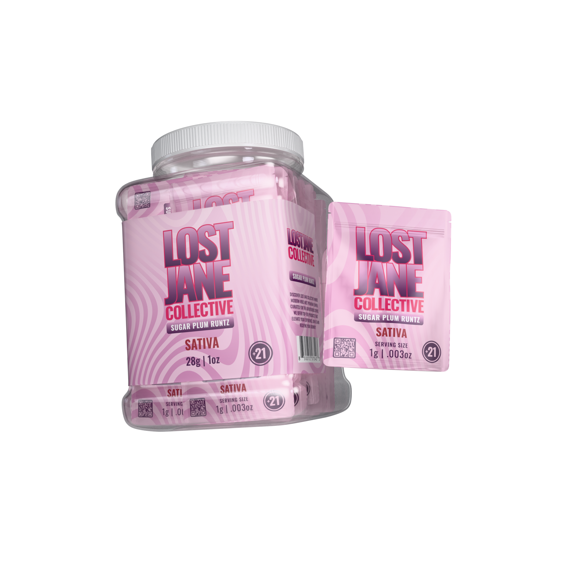 Lost Jane offers a selection of premium 1G jars, each filled with top-tier THCA flower known for its potency and flavor—featuring strains like Sugar Plum Runtz (Sativa), a sweet plum flavor with an energetic kick.