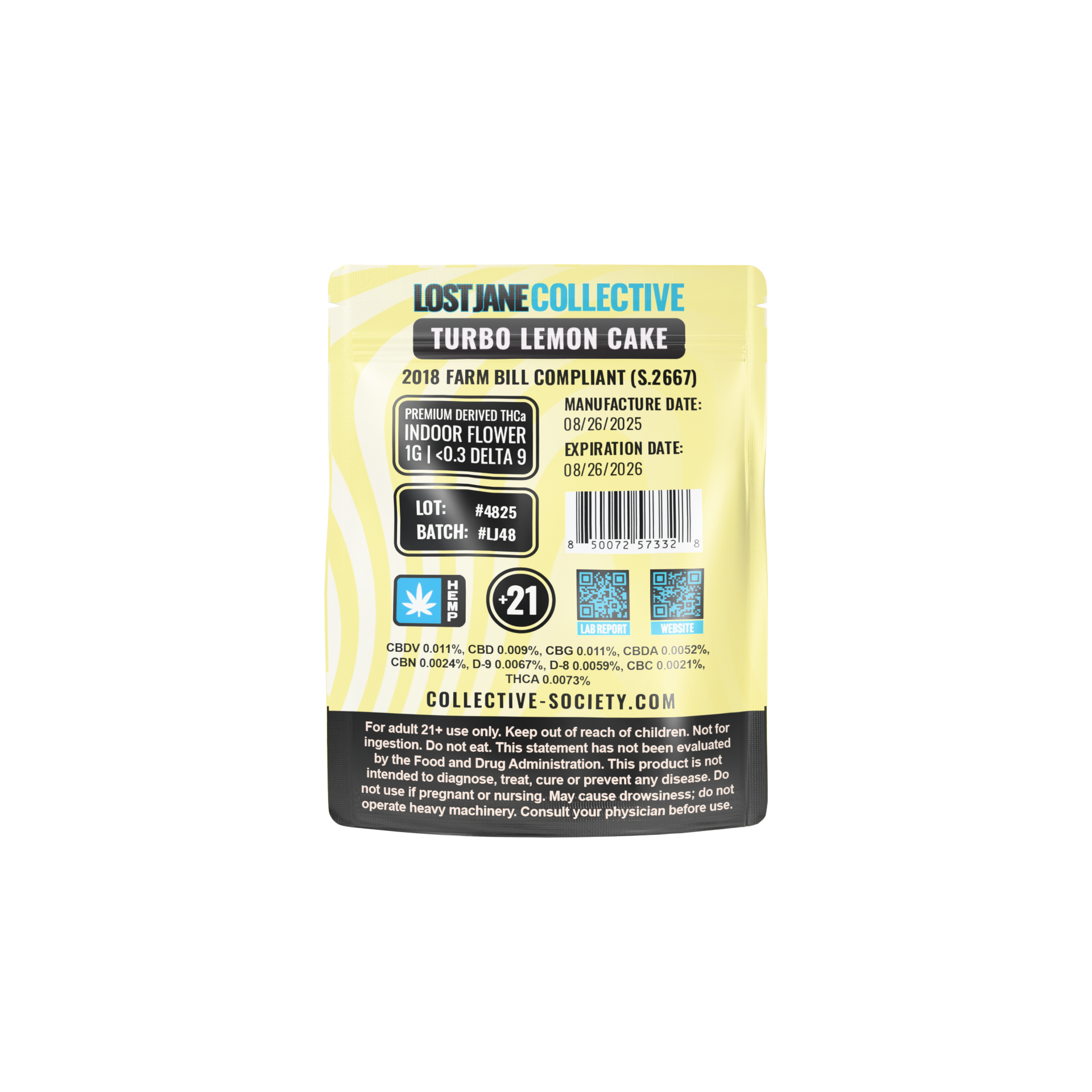Lost Jane offers a selection of premium 1G jars, each filled with top-tier THCA flower known for its potency and flavor—featuring strains like Turbo Lemon Cake (Sativa), a lemon cake flavor providing an uplifting experience.