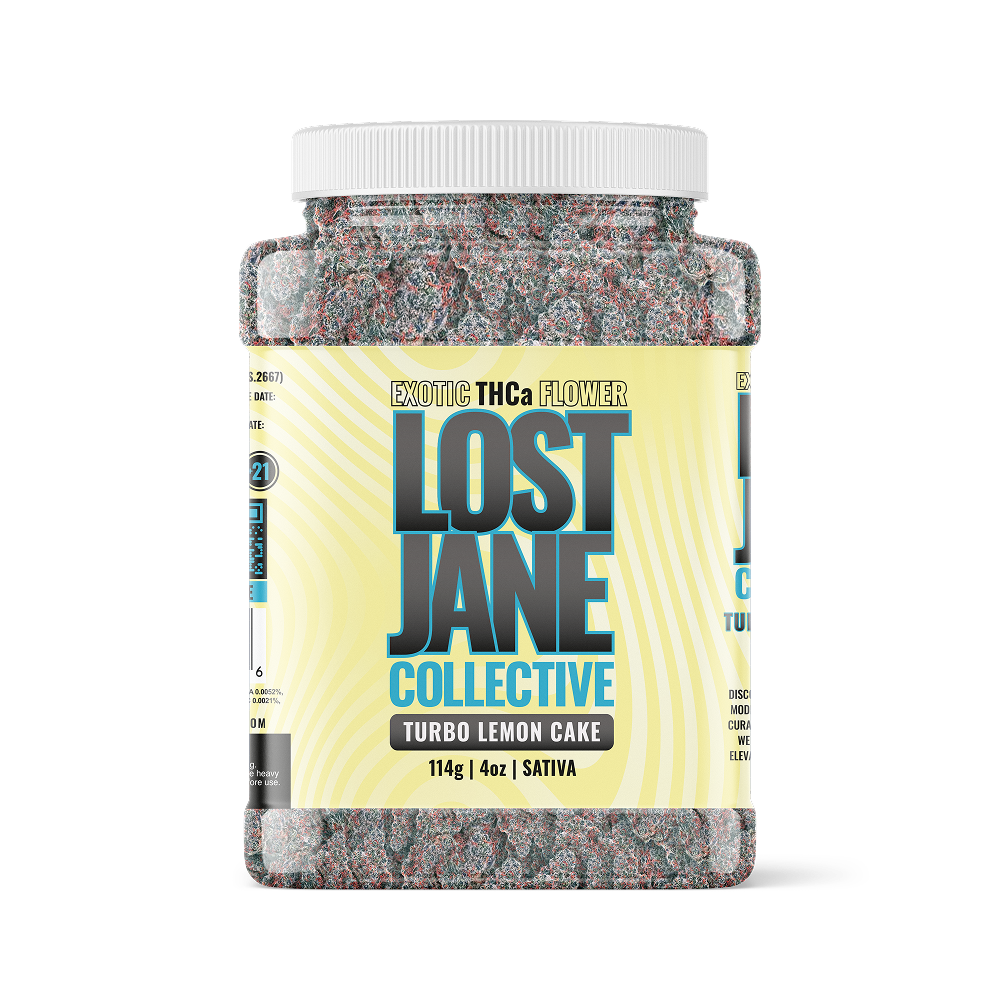 Lost Jane offers a selection of premium QP jars, each filled with top-tier THCA flower known for its potency and flavor—featuring strains like Turbo Lemon Cake (Sativa), a lemon cake flavor providing an uplifting experience.