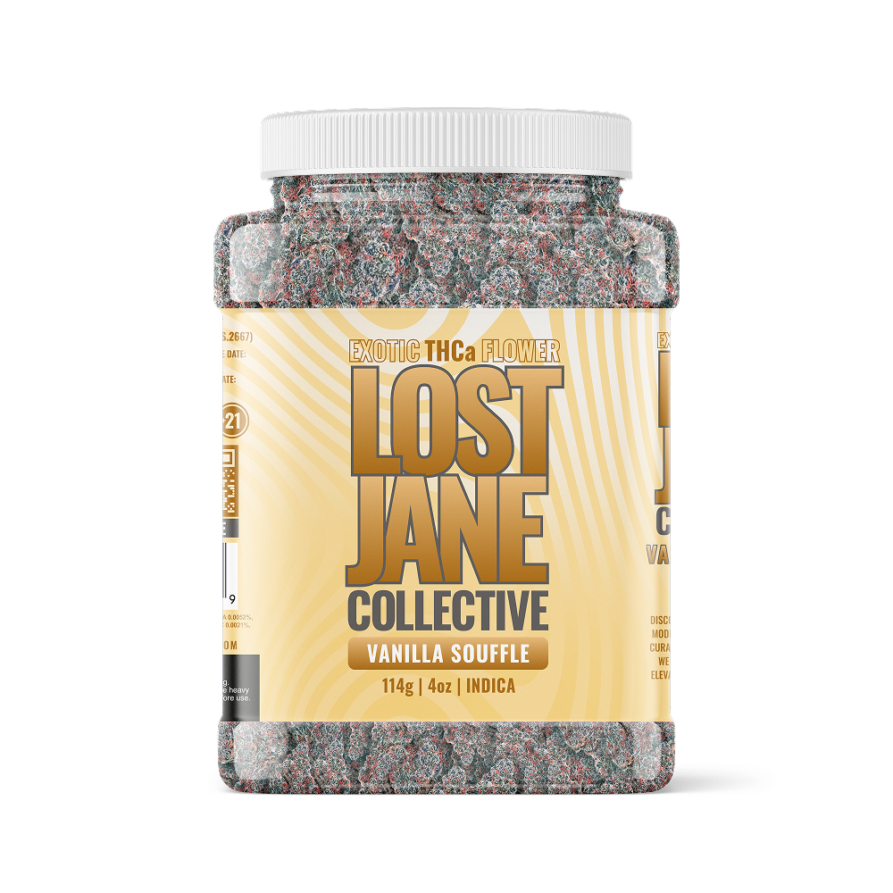 Lost Jane offers a selection of premium QP jars, each filled with top-tier THCA flower known for its potency and flavor—featuring strains like Vanilla Soufflé (Indica), a rich vanilla-flavored strain for nighttime use.