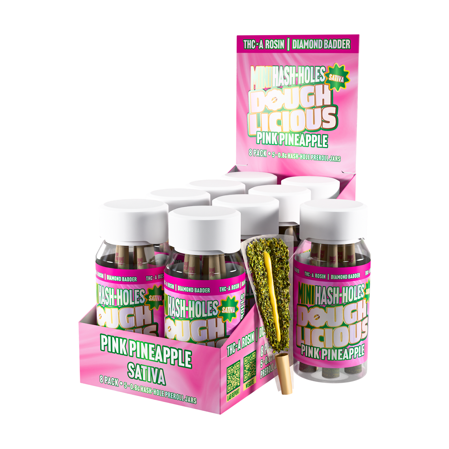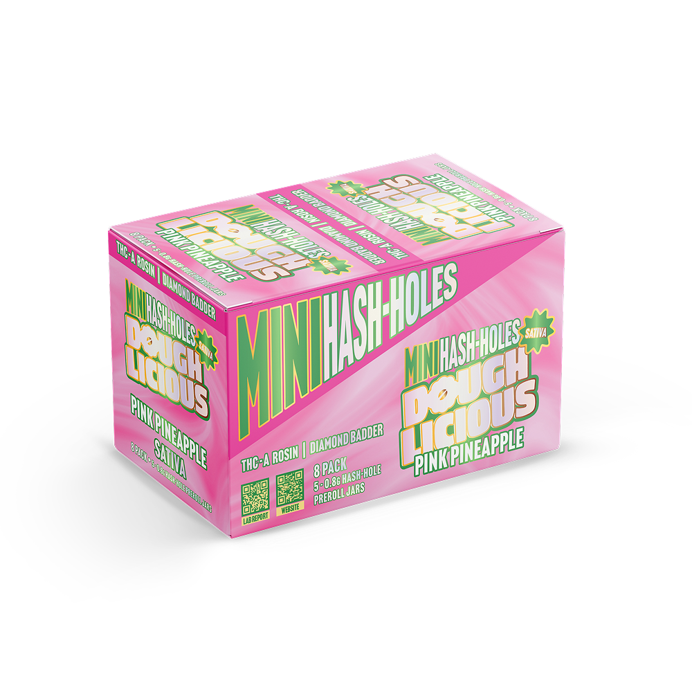 A lively mix of pineapple, guava, and pink candy. Each 0.8g pre-roll is infused with THCA Rosin and Diamond Badder, creating a slow-burning hash hole experience that’s bold, juicy, and euphorically smooth.