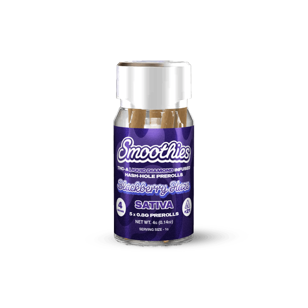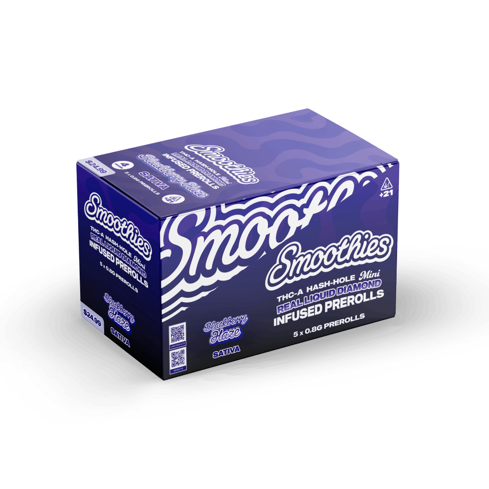 Dark blackberry tones wrapped in cool, airy herbiness. Each 0.8g mini pre-roll is infused with THCA Real Liquid Diamonds, enjoy a slow-burning hash-hole experience that’s fruity, terp-rich, and ultra-potent.